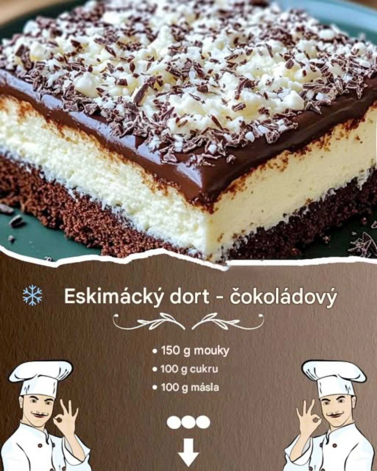 Má vláčný kakaový korpus, vysokou vrstvu jemného vanilkového krému a navrch čokoládovou polevu. Právě kontrast čokolády a svěžího krému dělá z tohoto dezertu stálici na oslavách, nedělních návštěvách i jako sladkou tečku ke kávě.