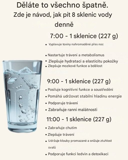 👉 Pokud máte pocit, že „to děláte špatně“, většinou chybí systém a drobná taktika. Ne síla vůle. Struktura dne, připomínky a malé rituály vás dovede k 8 sklenicím vody přirozeně – bez přemáhání a bez toho, abyste si kazili radost z jídla či dne.