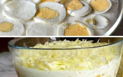Rychlý vrstvený salát do skleněné mísy: celer, kukuřice, pór, ananas, šunka, vajíčka a sýrová čepice. Přesné ingredience, postup, časy a…